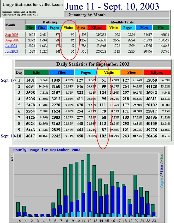 June 11 - Sept. 10, 2003 6489 total visits (more than 90 visits per day in September so far) (average of 85 visits per day in August) |